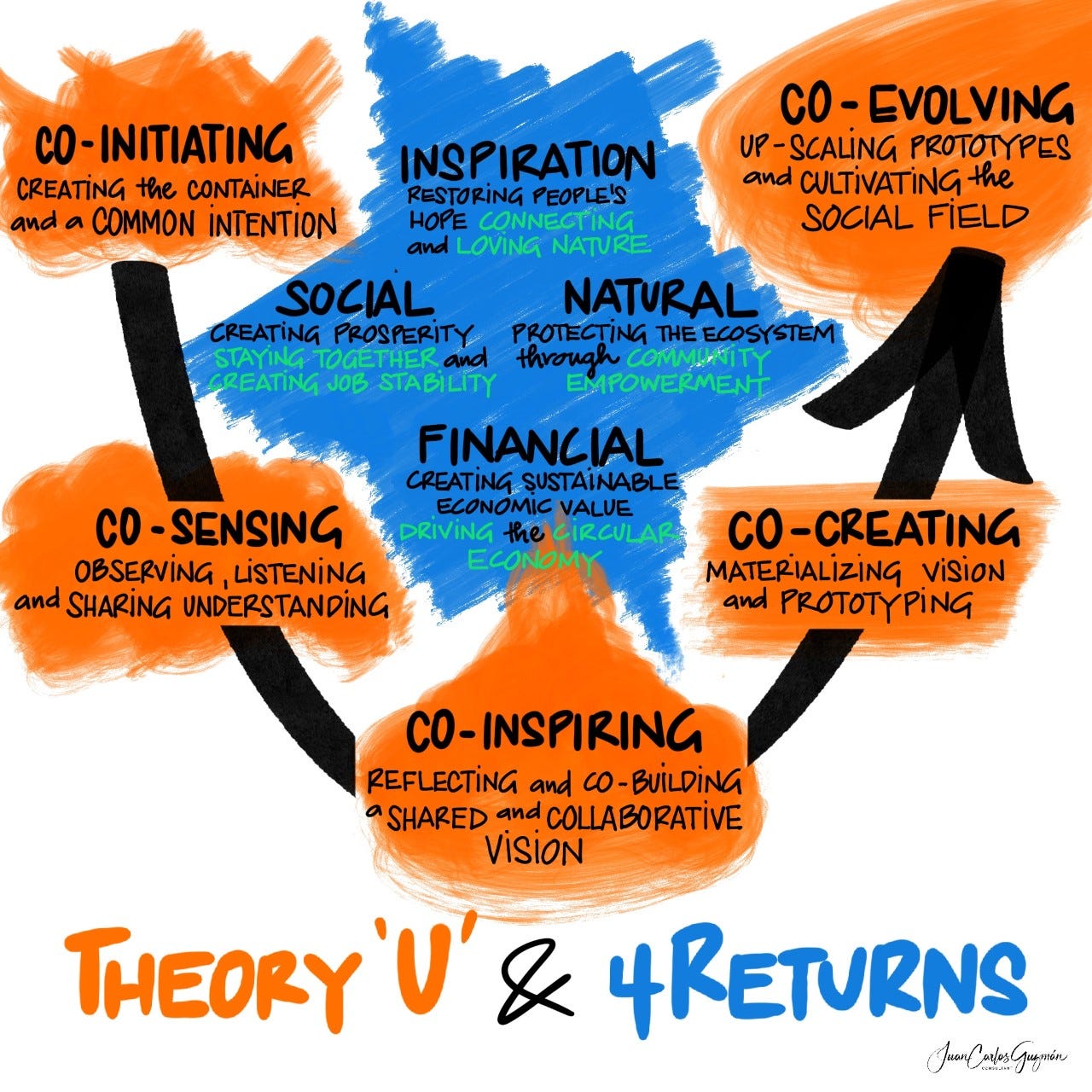 From Co-initation to Co-Evolving, taking time to travel together to go up and down the U to get there, integrated with the 4-Returns. Images from Juan Carlos Guzmán.