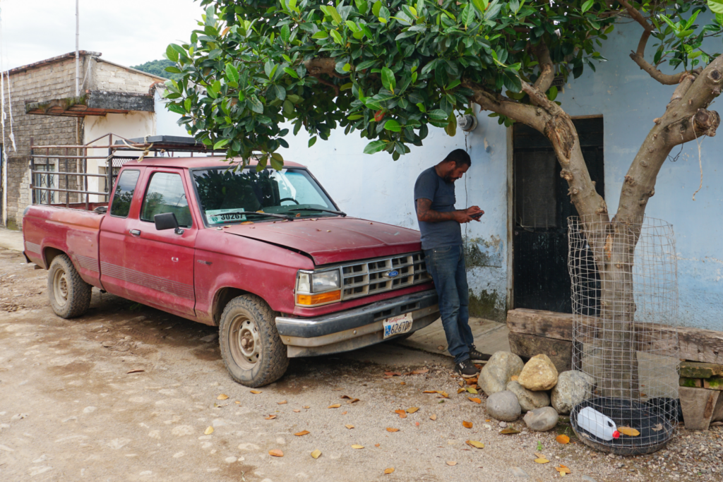 Eleno Ulloa waits outside the home of someone from whom he buys recyclable plastic in Ixtapa de la Concepción, Nayarit. (Photo: Maya Piedra, Global Press Mexico.)