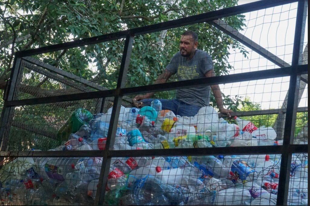 He got his start in 2018, driving a car through the streets of the town, announcing that he was purchasing plastic. “People thought I was crazy to go out collecting plastic,” he says. After making his announcements every day for three months, he succeeded in getting people to begin picking plastic items off the streets and selling them.