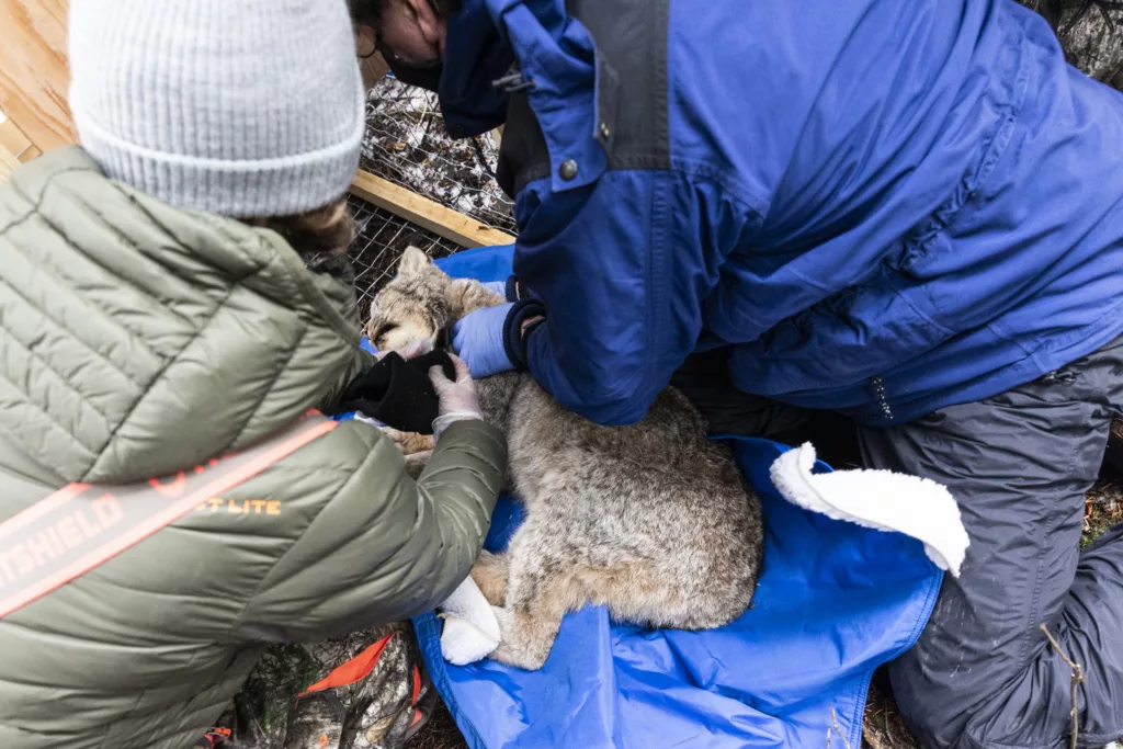 Rose Piccinini and wildlife veterinarian Mark Johnson lead the chemical immobilization of a lynx, to then perform a physical exam and fit the animal with a GPS collar, preparing it for transport and release on the Colville reservation. Photo by David Moskowitz