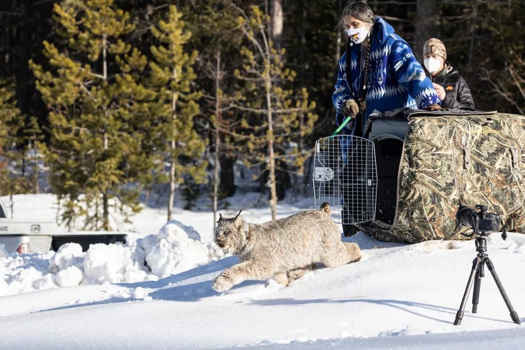 Shelly Boyd releases a Canada lynx on to the Colville Tribe’s reservation. Photo by David Moskowitz
