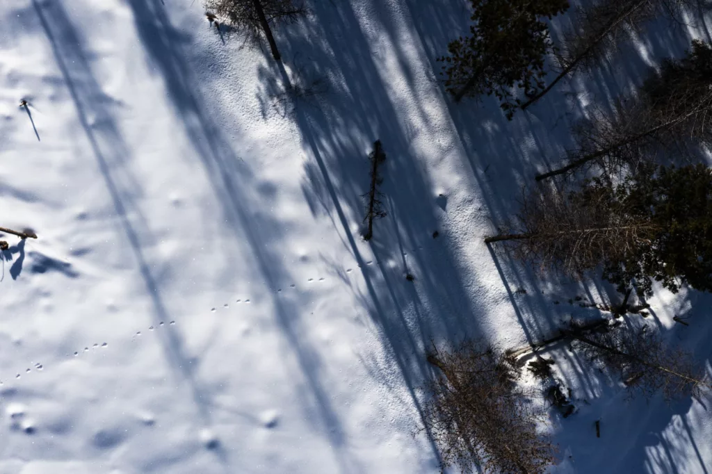 The tracks of a lynx that was just released trail into the forest on the Colville reservation. Photo by David Moskowitz