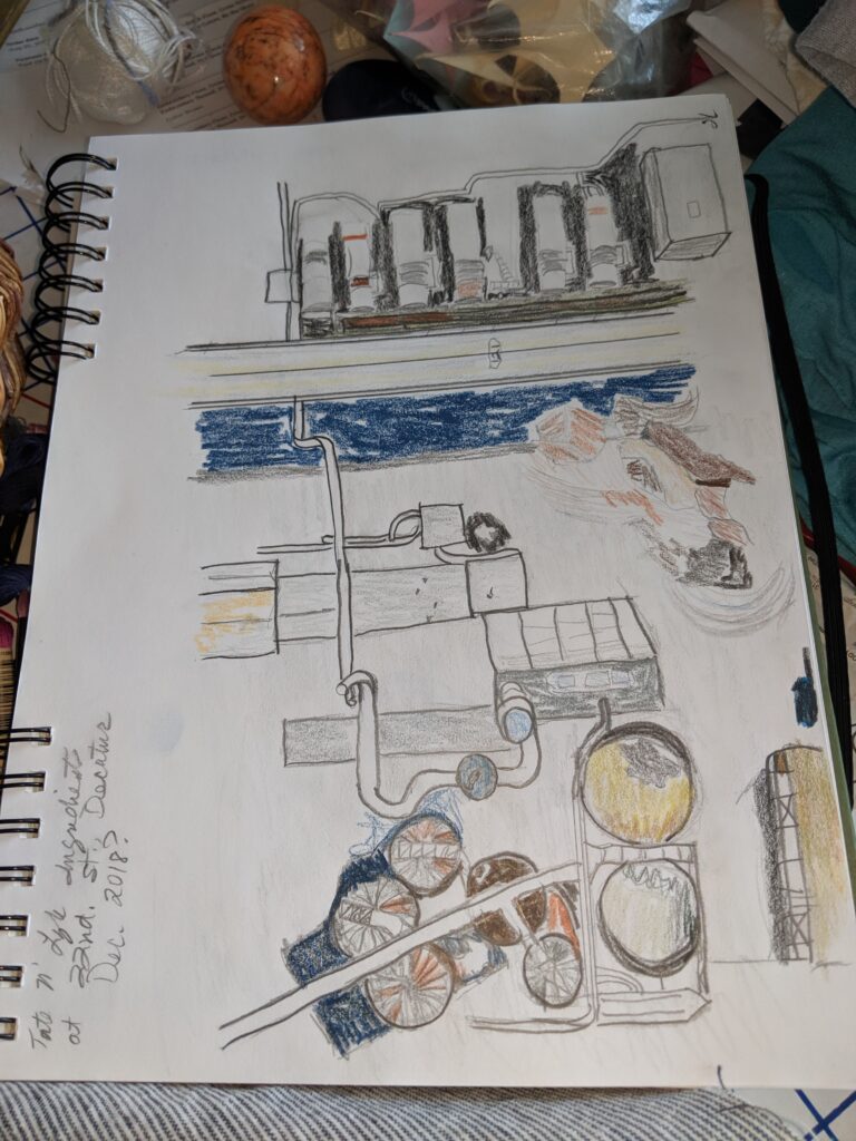 The author’s freehand drawing of the “web” of grain processing silos near where she once lived. Photo credit: Sandra Lindberg