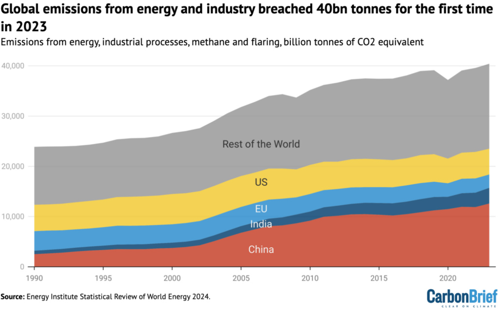 Global emissions from energy use, industrial processes, methane and flaring, billion tonnes of CO2 equivalent, 1990-2023. Source: Energy Institute Statistical Review of World Energy 2024. Chart by Carbon Brief.