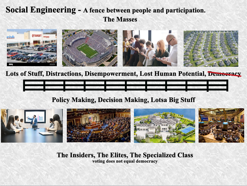 This graphic shows the fence created by social engineering that, to a large degree, diminishes the public’s participation in shaping public policy and affairs.