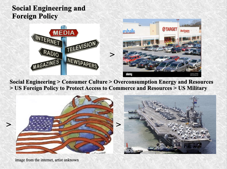 Many capable writers and researchers have penned volumes about US foreign policy and US military force projection, both critical and in support. The Primer does not need to duplicate those efforts but the Primer does offer a tangent of interest to this discussion and that is, what is the relationship between US foreign policy and its military in regard to the consumer culture, paradigm shift and permaculture.