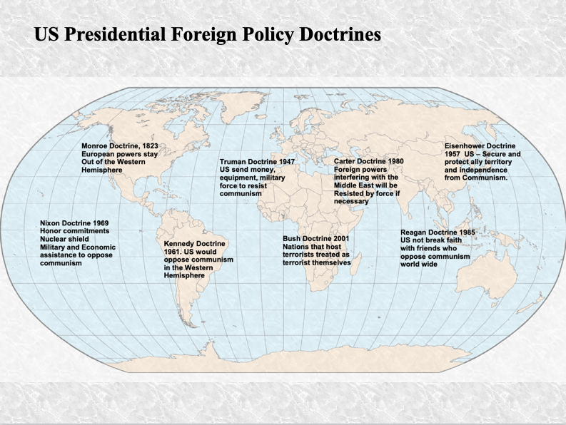 Every nation has self-interests. The wealthier and more powerful the nation, the more able and likely that nation will assert itself on the global stage. These US policy doctrines show the self-interest of the US is at a global scale. This is the realm of a superpower, the interests are economic above all and mean to push back on those who pose a threat to those interests. The Soviet Union was the primary adversary to US interests until its dissolution in the early 1990’s. In recent years, Russia has significantly re-occupied the role of the Soviet Union as a primary adversary to the US and the West and is now, joined by China, fast becoming a rival superpower in its own right.