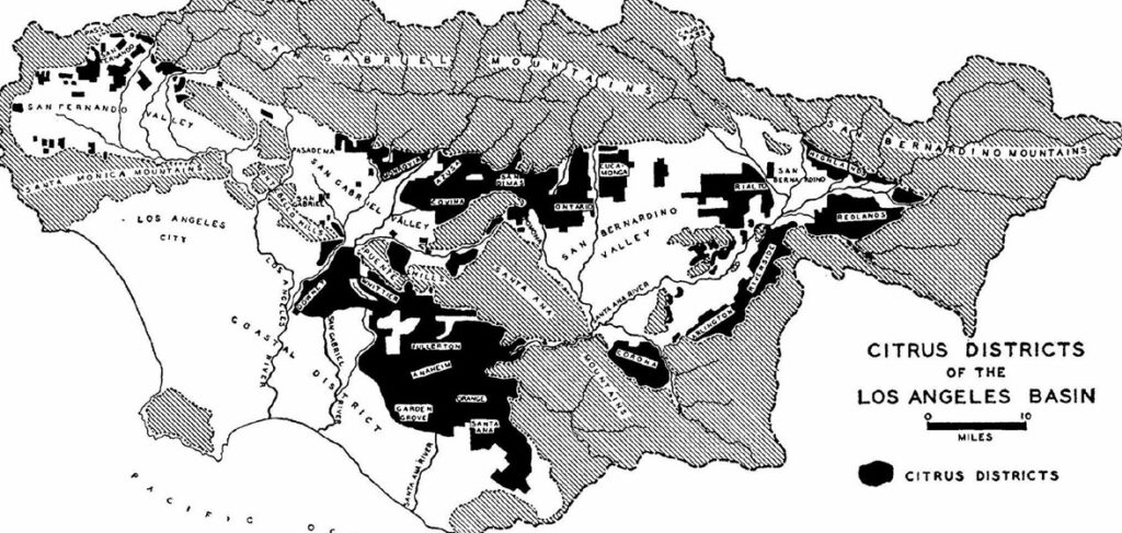 Flood and drought followed. A severe flood in the early 1860’s was followed by back to back droughts which killed over a hundred thousand cattle, collapsing the cattle economy. On its heels came citrus and wheat production, and a burgeoning wine sector. American control brought the railroad in 1870, and soon the region was exporting water by the orange, bushel and wine bottle.