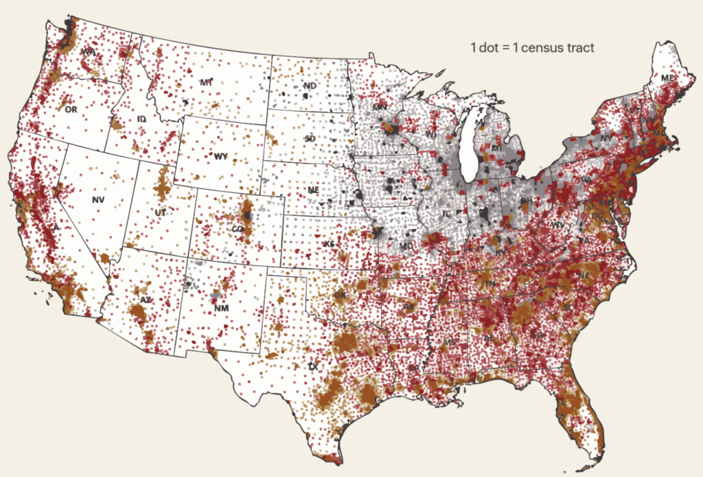 This map by First Street illustrates the climate risks and overall resilience of communities across the country, detailing that 26% of neighborhoods will likely see a climate “abandonment” future – areas are where climate risks and insurance premiums are high enough that population is declining – while roughly 5% of neighborhoods are likely to experience growth.