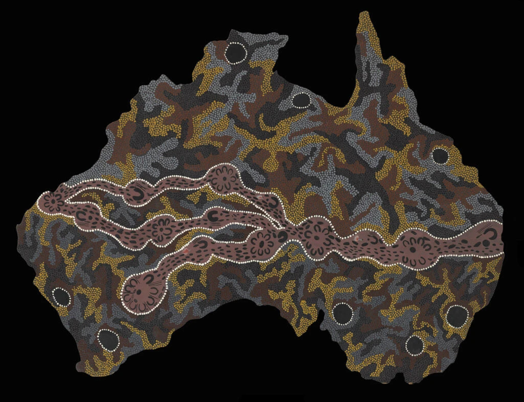 2’Songlines: Tracking the Seven Sisters’ was conceived and curated by a team of First Australians, led by Margo Neale, Senior Indigenous Curator at the National Museum of Australia and custodial elders from across the Central and Western Deserts of Australia.