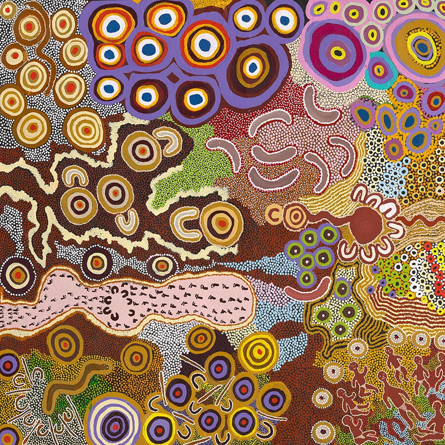 Anawari Inpiti Mitchell, Angilyiya Tjapiti, Mitchell, Lalla West, Jennifer Nginyaka Mitchell, Eileen Tjayanka Woods, Lesley Laidlaw and Robert Muntantji Woods, Kungkarrangkalpa Tjukurrpa, 2015. Angilyiya Tjapiti Mitchell, Kungkarrangkalpa (Seven Sisters), 2014. Courtesy: ยฉ the artists/Copyright Agency 2020 and National Museum of Australia