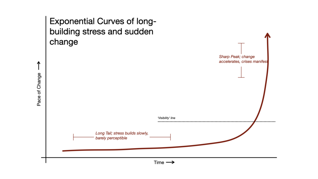 In complexity science, we explore how small events, perhaps barely perceptible, can combine over time to produce major changes within and across systems (the proverbial butterfly effect). And the pace of these changes doesn’t always stay constant, but can accelerate as forces build and converge. We call this process an exponential curve, where small and slow shifts—the ‘long tail’—suddenly become big and fast change—the ‘steep’ curve.