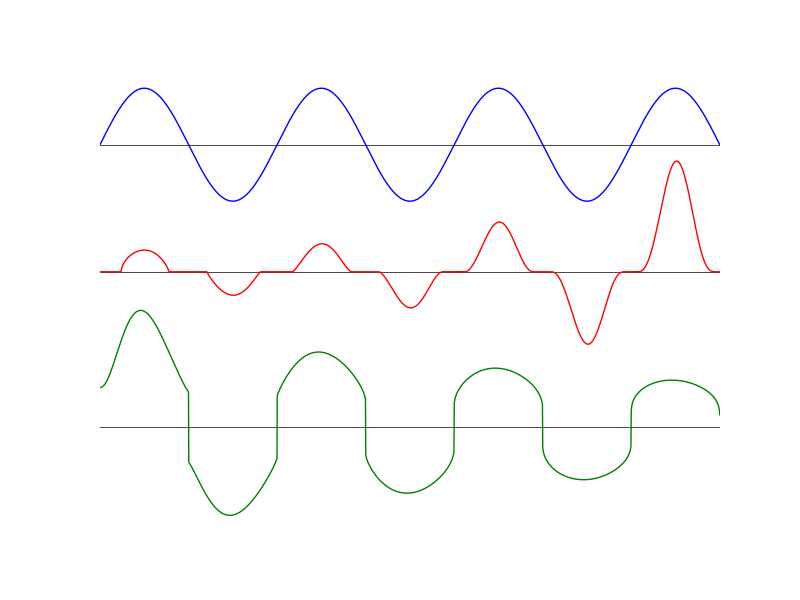 Above is an example. The blue curve at top is a pristine sine wave that you want to amplify, without suffering distortion. But if fed the blue signal, the powerful-but-junky amplifier creates the red curve, which I constructed to have a time-variable crossover distortion (dead spots), and a time-variable nonlinearity continuously evolving from a square-root at the left edge to a cube at the right edge. The red curve looks (and sounds) nothing like the blue curve, and is one trashy signal. But if the nonlinear beast is stuck into the feedback loop, the op-amp contrives the green signal at bottom to feed to the beast, “tricking” it into putting out the blue signal with greater amperage capability. It does so by constantly checking the output (comparing it to the “+” input) and quickly adjusting however it needs in order to make them match. It’s stupidly clever.