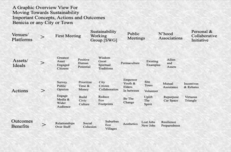 The most important start for boosting sustainability in Benicia or any town is empowering citizen action. Sustainability should be owned by people where they live, in how they invest their own time and money at home, in the community, what they expect from the city, where they work and their relationships with others. People should have a much higher expectation for their quality – not quantity – of life, well-being and their own responsibility to make it better. The city is a critical partner. Both city and citizens have capacities the other does not and their combined output can be elevated greatly by complementing each other.