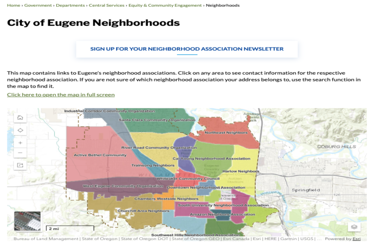 This map shows the geographic locations of Eugene, Oregon’s 25 neighborhoods and organizations. Many cities and towns have nighborhood associations. NAs are perhaps the single most important asset a city or town can have for moving towards sustainability.