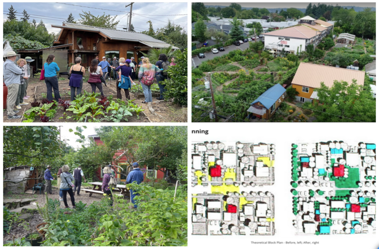 Several examples of what sustainability can look like. A site tour to the suthor’s 25 year old ¼ acre suburban transformation project in Eugene. An aerial view of Kailash Eco Village in Portland, Oregon. kailashecovillage.org A site tour of East Blair Housing Co-op in Eugene. eastblairhousingcooperative.com A graphic showing before and after, block planning. suburbanpermaculture.org/block-planning.