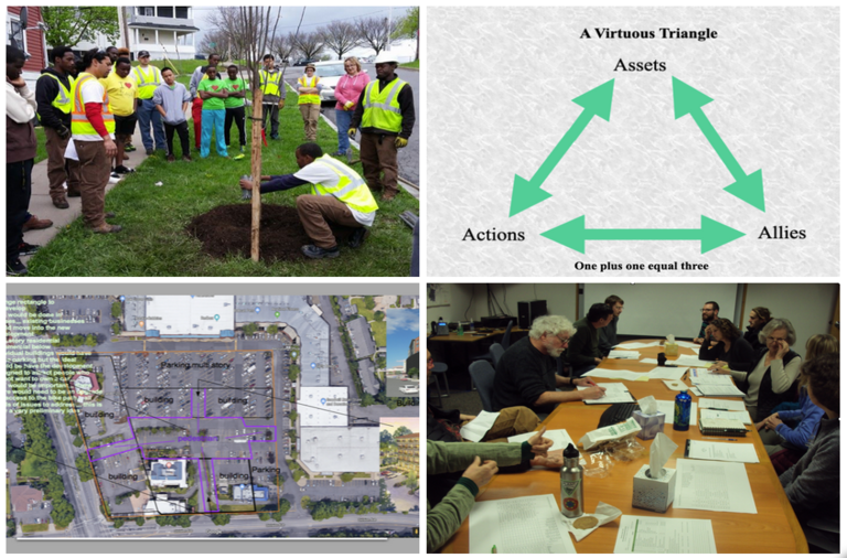 Aspects of sustainability. Young people and community service. The Virtuous Triangle, 1 + 1 = 3. City and citizens meet. Transforming a suburban strip mall parking lot into a mixed-use micro downtown.